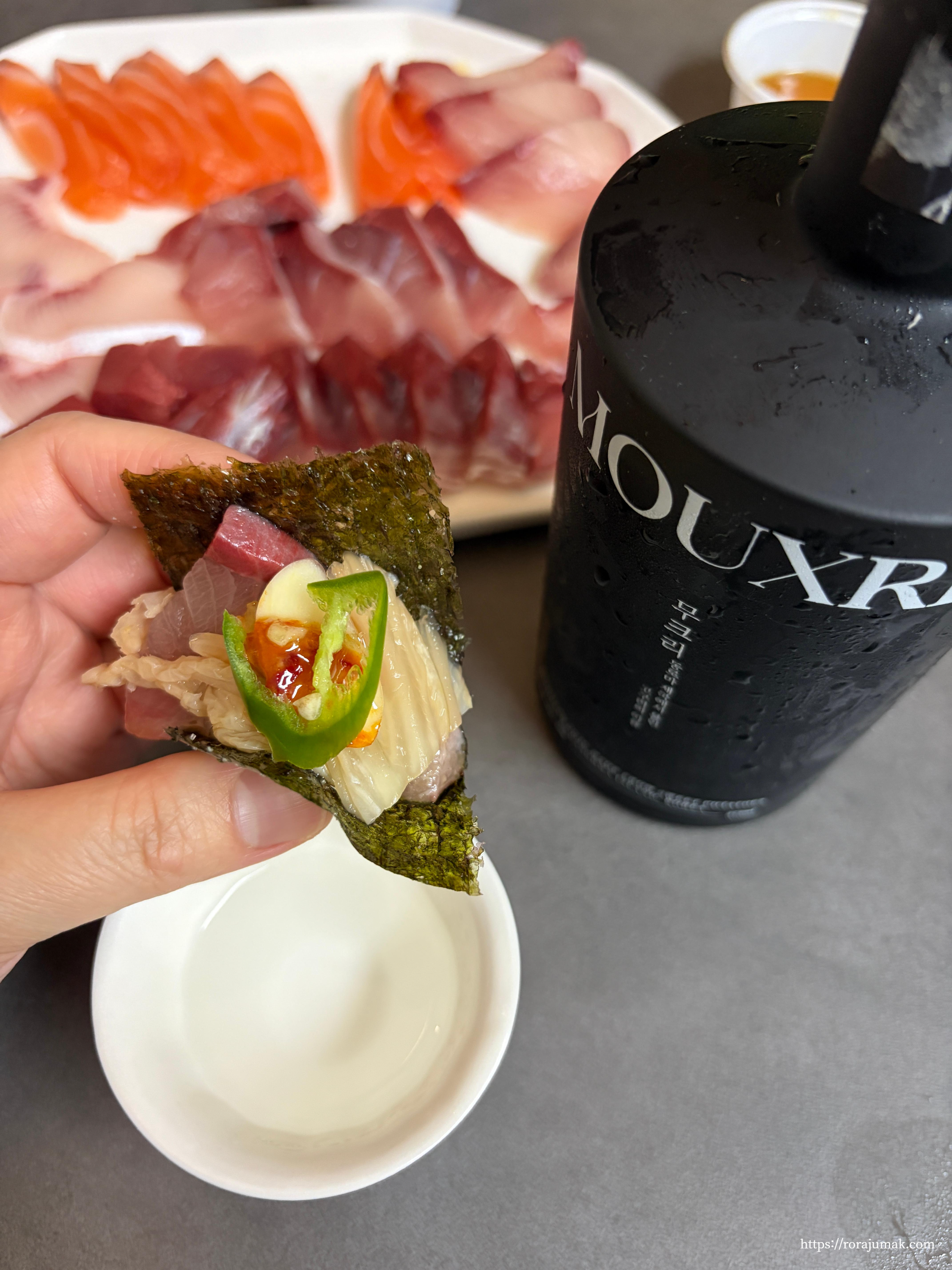 드디어 방어의 계절이 되었습니다! 무크리를 시음해보는 순간, 이건 방어랑 먹어야겠다! 라는 생각이 들었었는데요. 제품 팜플릿을 보니 어울리는 안주가 기름진 생선회, 한우 스테이크, 복지리탕이라고 하더라고요. 방어회는 꽤나 성공적인 페어링인것 같죠?