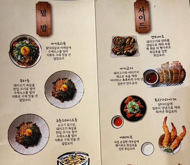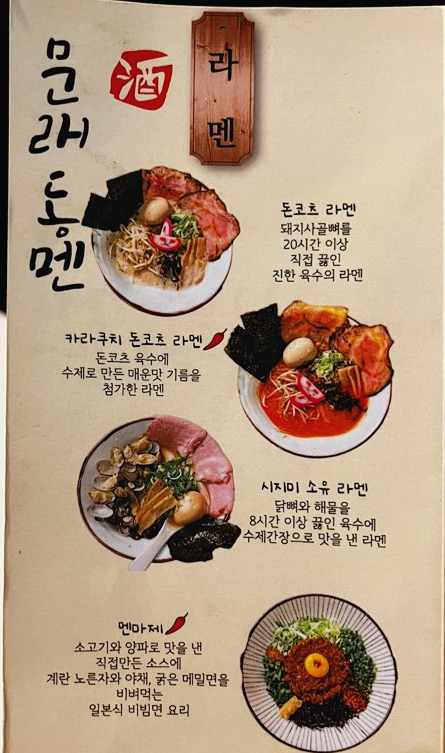 메뉴는 크게 라멘, 덮밥, 사이드, 주류 메뉴로 나눌 수 있는데요. 매운 메뉴는 고추 그림이 그려져 있어서 아이들과 함께 방문했을 때 참고하기 좋았습니다. 저희는 지난번 방문 때 맛있었던 메뉴들만 골라서 시켜보았어요.