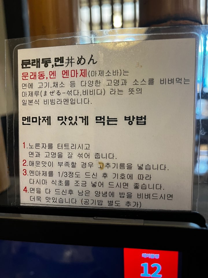 멘마제는 고추그림이 한 개 그려져 있었는데 맵린이인 저에게는 꽤 매웠어요. 멘마제는 어느 정도 먹은 후에 다시마 식초를 넣어서 먹으면 감칠맛과 함께 면이 촉촉해져서 훨씬 맛있답니다. 꼭 해보세요. 소스가 남는다면 공깃밥을 비벼 먹는 방법도 추천합니다.