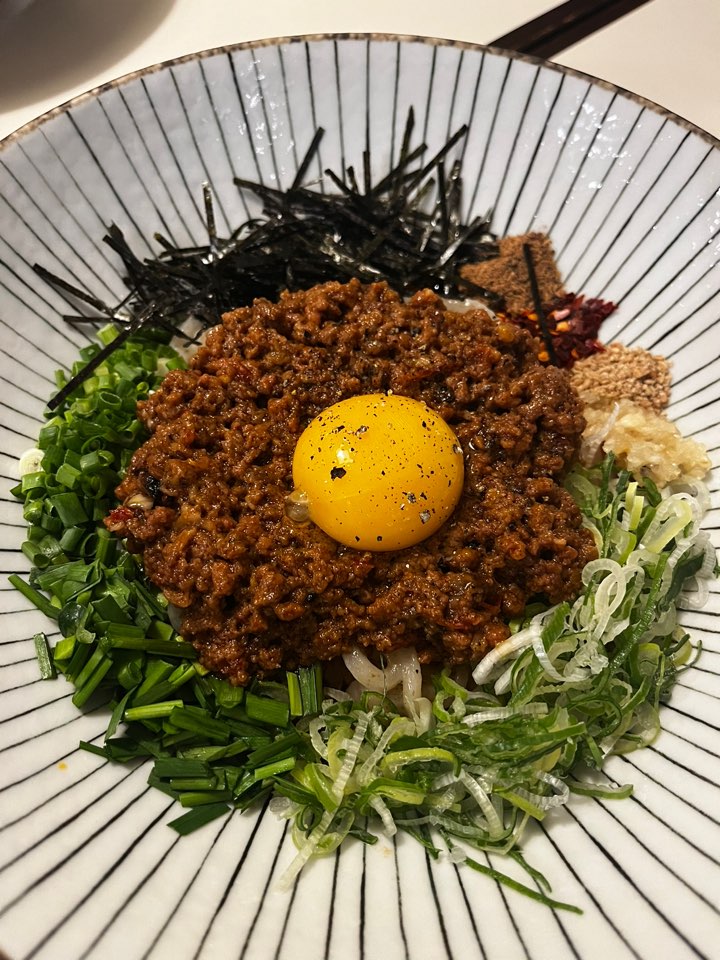 가장 맛있었던 메뉴는 야키토리동(닭고기덮밥)입니다. 숯불향이 나는 닭고기가 부드러우면서 짭조름해서 밥과 함께 비벼먹기 좋았어요. 바삭한 마늘칩이 식감을 풍부하게 해 주네요.