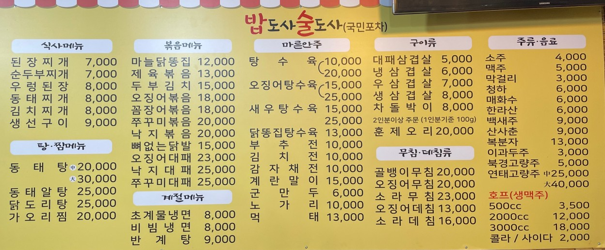 곤지암 할매 소머리국밥집과 함께 운영되고 있어요. 사진에서 보이는 노란 간판의 국밥집 우측이 밥도사 술도사입니다. 간판은 따로 되어 있지만 내부는 연결되어 있고 어디서든 양쪽 식당의 모든 메뉴가 주문 가능합니다.