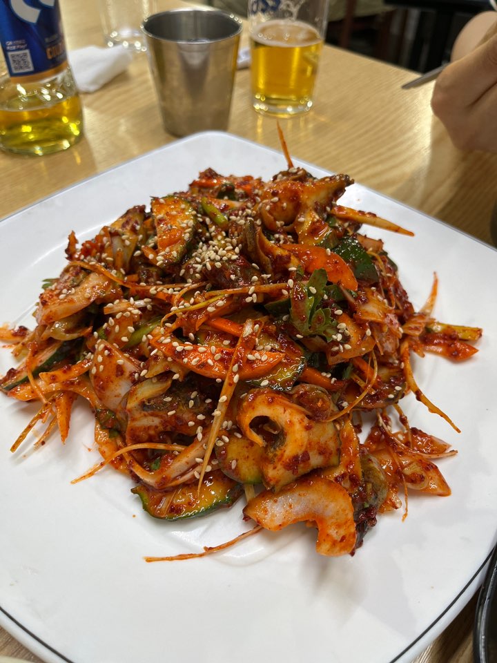 손님이 많지 않았는데 소라무침 나오는데까지 시간이 좀 걸렸어요. 하지만 먹자마자 기다린 시간이 하나도 안아깝더라고요. 바로 삶아 살짝 온기가 남아있는 소라는 아주 두툼했고 매콤새콤한 양념장에 버무려진 아삭한 야채들도 신선했습니다. 너무 맛있게 먹었어요!