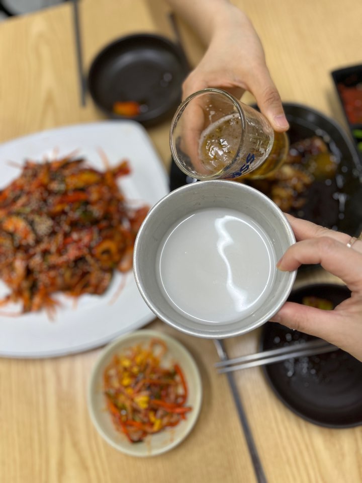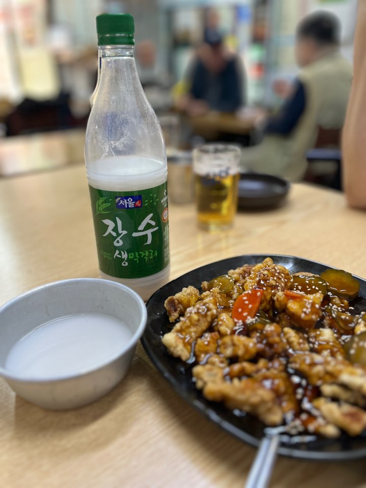탕수육 소(10,000원), 소라무침(23,000원), 장수막걸리, 맥주를 주문했어요. 사진을 찍지 못했는데 기본으로 세 가지 밑반찬이 나오거든요. 이게 뭐라고 너무 맛있어서 리필했답니다. 밑반찬으로 맥주 한 병을 마시고 있으니 탕수육이 먼저 나옵니다.