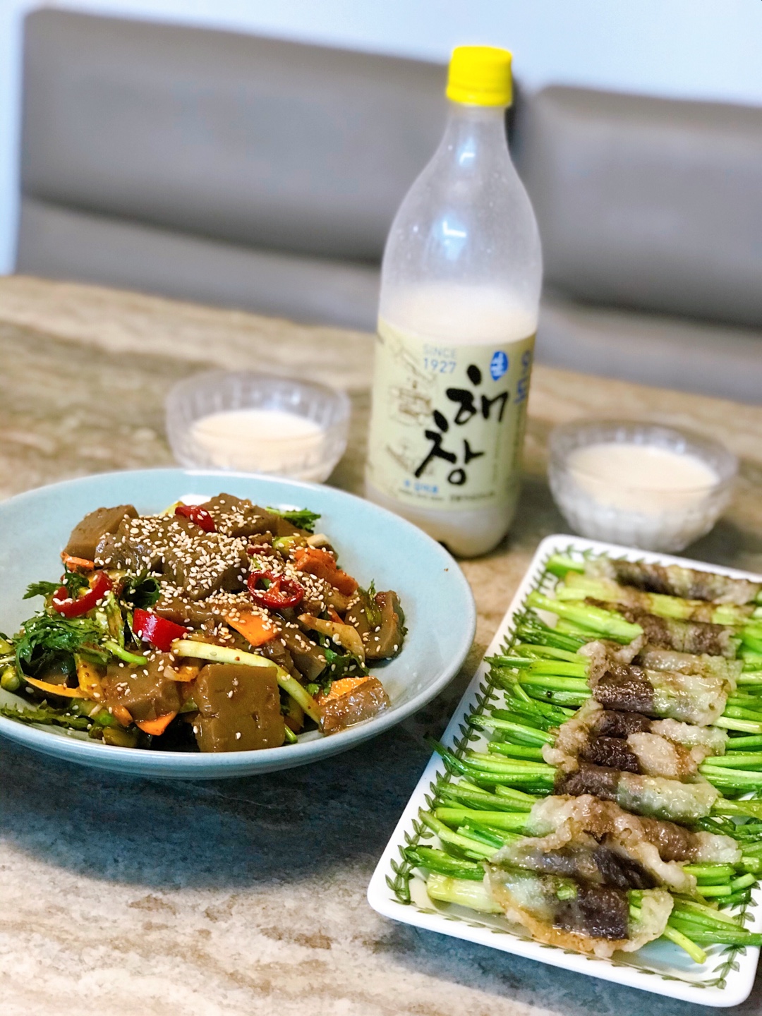 모둠전, 두부김치를 잇는 막걸리 안주의 클래식, 막걸리 안주의 정석은 도토리묵이 아닐까요? 막걸리를 좋아하시는 아버지를 위해 맛있게 마셨던 해창 막걸리를 사들고 친정집에 놀러 간 날입니다. 막걸리를 좋아하는 모녀를 위해 요리 고수인 친정엄마는 앞치마를 두르셨습니다. 너무나 흔한 막걸리 안주이지만, 엄마의 손맛이 더해진 도토리묵은 그 어떤 맛있는 식당의 도토리묵도 이길 수가 없습니다. 엄마표 도토리묵과 미나리 차돌 말이! 안 그래도 맛있는 해창 막걸리가 더욱 맛있습니다.