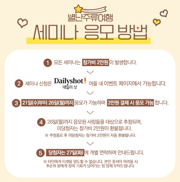 양일간 각종 세미나가 진행됩니다. 모든 세미나는 참가비 2만 원이 발생하며 2월 21일(수)부터 26일(월)까지 세미나 신청이 가능하답니다.(데일리샷 이벤트 페이지) 신청한다고 다 되는 것은 아니고 신청자들 대상으로 추첨하여 세미나를 들을 수 있다고 하네요. 당첨자는 27일(화)에 개별 연락을 줍니다.