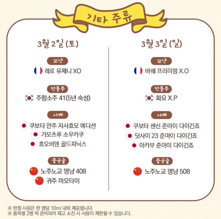 아무래도 값비싼 술들은 무작정 시음이 가능하지는 않아요. 50여 종은 요일별 한정 시음이 가능한 주류들이랍니다. 꼭 마셔보고 싶은 술이 있는지 한 번 확인해 보세요!