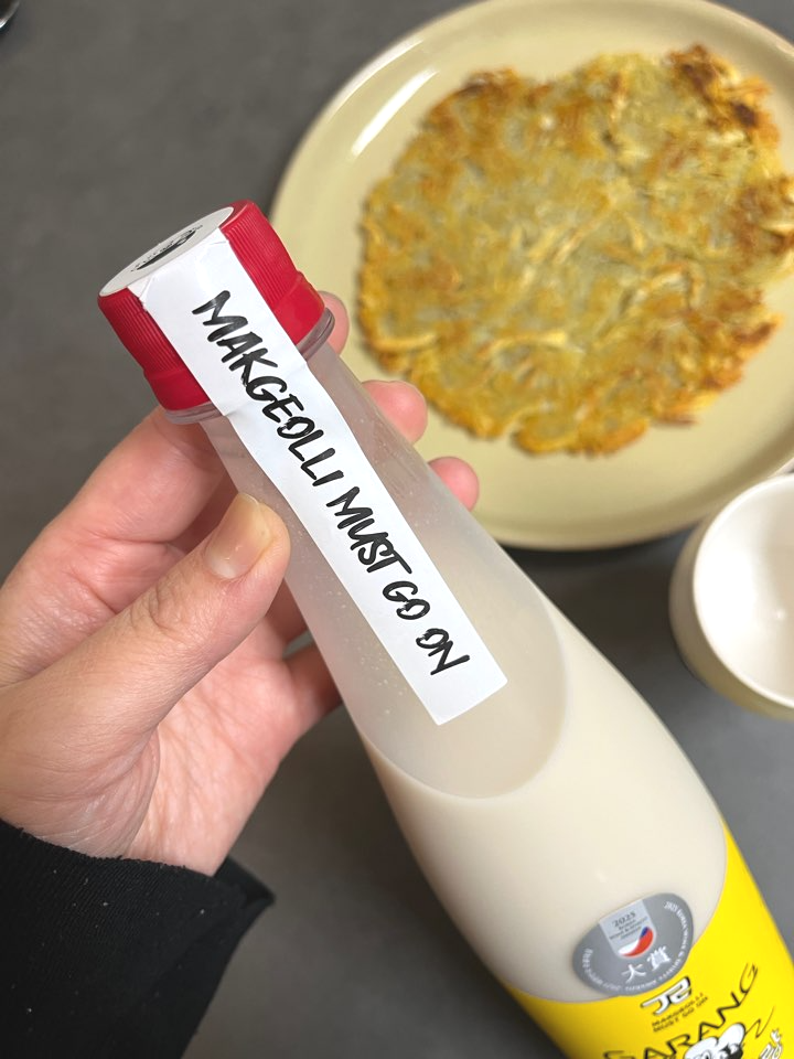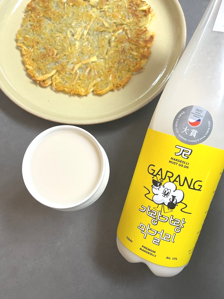 12도 정도 되는 막걸리는 살짝 무거운 안주와 잘 어울리더라고요. 그래서 저는 가랑가랑 막걸리를 부침개와 함께 즐겨봤어요. 두 번에 걸쳐 나눠 마셔서 처음엔 감자전과, 두번째에는 김치전, 애호박전과 함께 마셨어요.