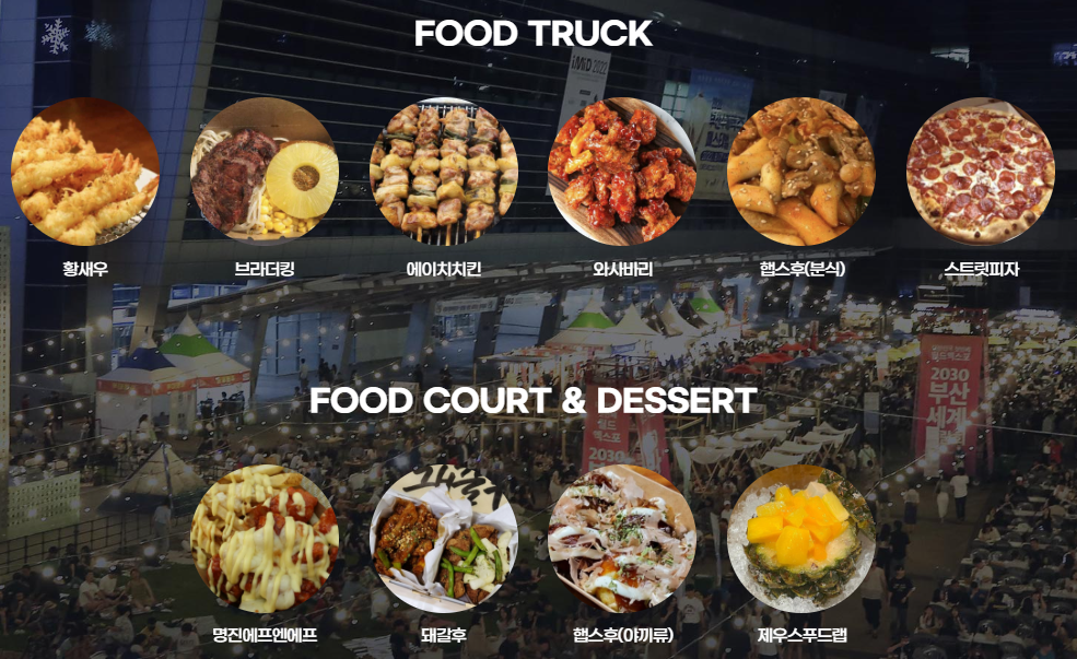 푸드트럭 메뉴는 황새우(새우튀김, 먹태), 브라더킹(스테이크), 에이치치킨(닭꼬치), 와사바리(닭강정), 햅스후(분식), 스트릿피자가 있습니다. 푸드 코트에는 명진에프엔에프(치즈 닭강정), 돼갈후(돼지갈비 후라이드), 제우스푸드랩(파인애플 샤베트)가 준비되어 있네요.
