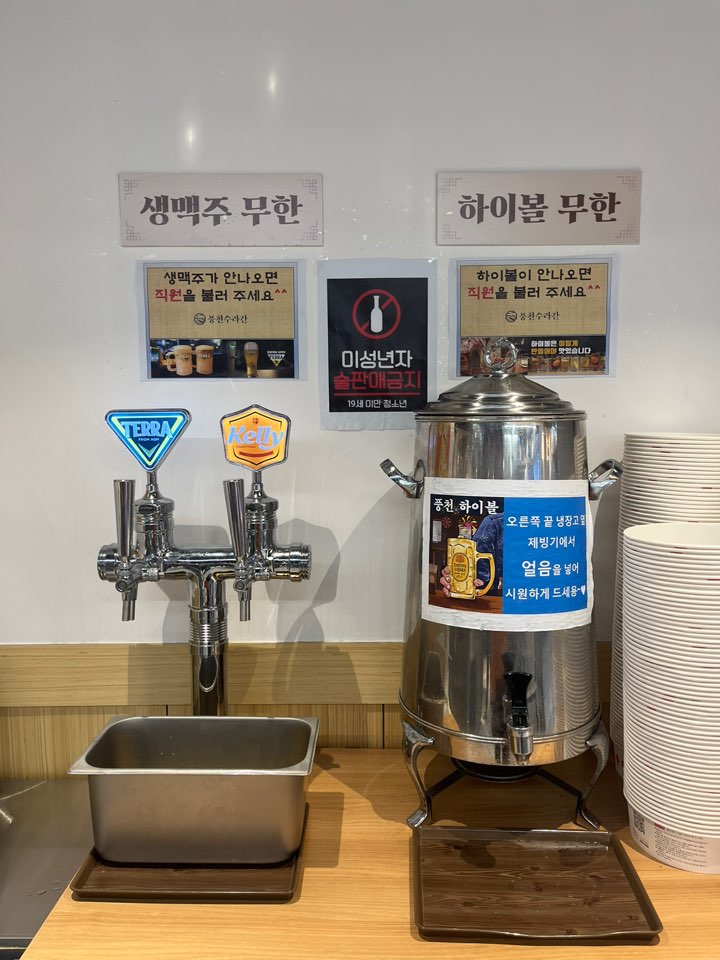 성인 1인당 900원을 추가하면 주류까지 무제한으로 즐기실 수 있어요. 술을 드신다면 무조건 주류 무제한을 추가하시는 게 이득이겠죠? 무제한으로 먹을 수 있는 주류는 생맥주(테라/켈리), 하이볼, 소입니다. 캔음료와 병으로 된 주류는 추가 금액을 내야합니다.