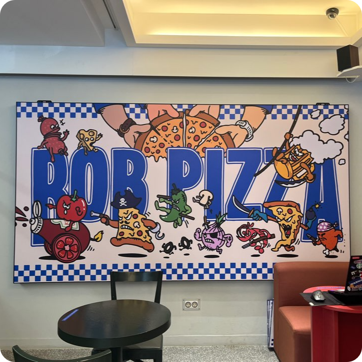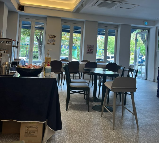 블루 컬러의 인테리어가 시원해 보여요. 테라스가 있어서 요즘 같은 날에는 밖에서 맥주와 함께 피자를 즐기기 좋겠습니다. 내부는 2인석, 4인석, 8인석 다양한 구성의 테이블이 준비되어 있어요. 알록달록한 테이블과 포스터들이 힙한 느낌을 줍니다. 넓고 쾌적하네요.