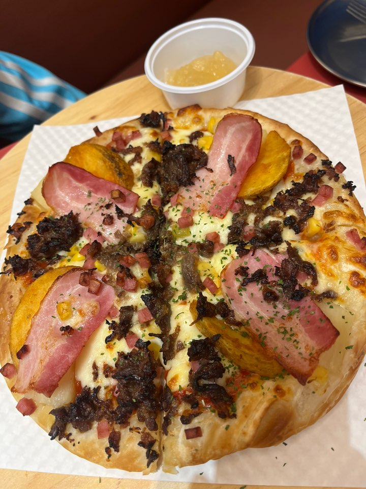 콤비네이션 피자는 치즈와 토핑들이 정말 실하게 들어있어서 한 조각이 아주 묵직했어요. 원래 할라피뇨 토핑도 올라가는데 저희는 빼달라고 요청했고요. 패스츄리 도우로 선택해서 사과잼이 함께 제공되었습니다. 독특해요.