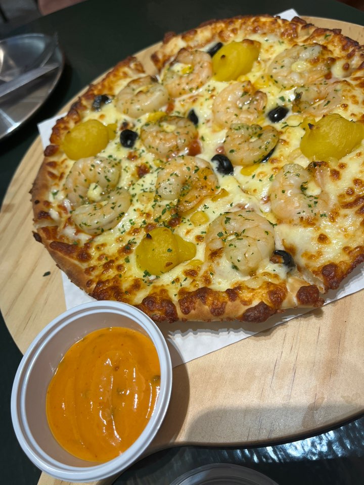 더 킹 쉬림프 피자는 통통한 새우와 고구마가 올라가는 달달한 피자입니다. 그래서 매콤한 스리라차 소스가 함께 나왔어요. 느끼할 때 쯤 한 번씩 찍어먹기 좋습니다. (꽤나 매워요.) 베스트 메뉴인 이유가 있었네요. 이 피자도 역시 피자 치즈가 넉넉하게 들어가서 한 조각이 아주 묵직하고 든든했어요.