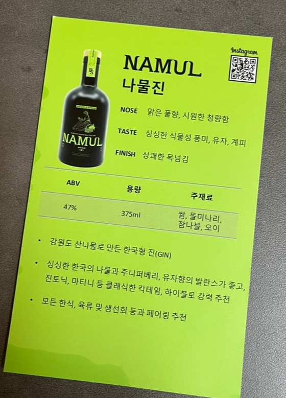 나물진은 강원도 산나물로 만든 한국형 진입니다. 싱싱한 한국의 나물과 주니퍼베리, 유자향의 밸런스가 좋고 진토닉, 마티니 등 클래식한 칵테일이나 하이볼로 마시기 좋은 술입니다.