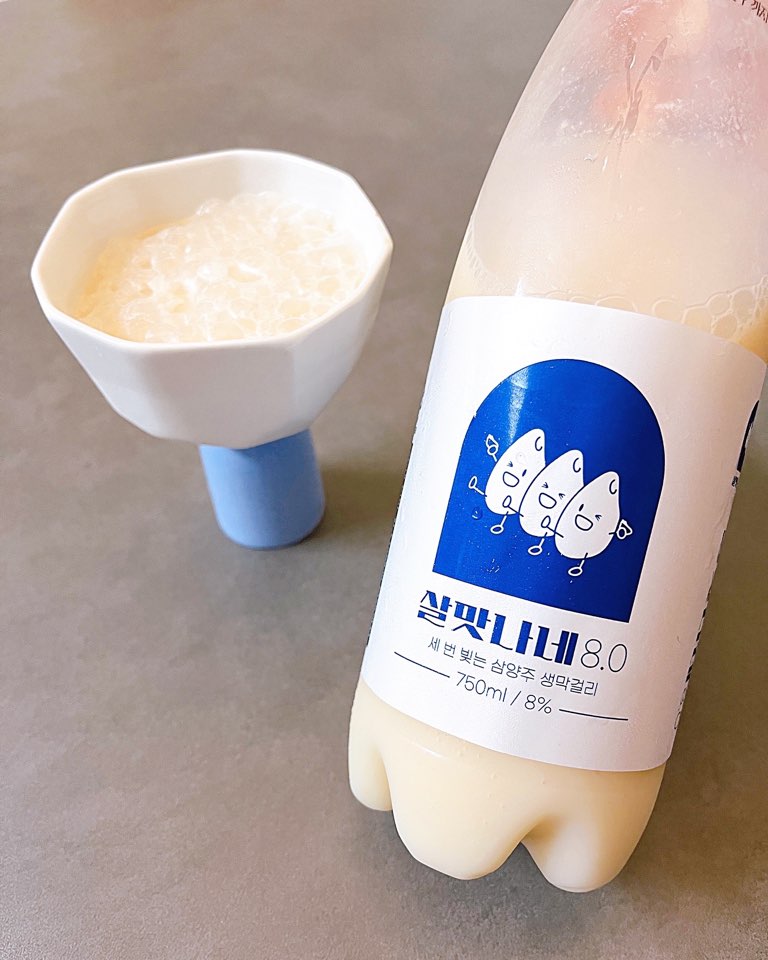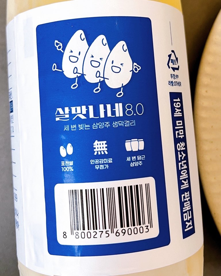 살맛나네 막걸리는 라벨에 쌀 3알이 귀엽게 그려져있는데요. 세번 빚은 삼양주라는 것을 표현한 것 같아요. 경기도 포천 햅쌀만을 이용하여 인공감미료 없이 빚어지는 프리미엄 탁주입니다.