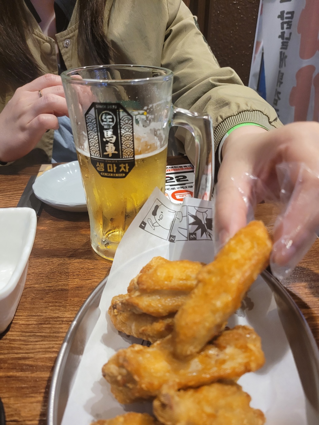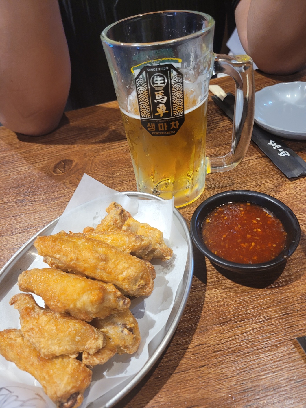 2차로 방문한 곳이라서 배가 불렀던터라 저희는 테바나카 10조각과 생맥주 한 잔을 주문했어요. 1900원짜리 생맥주는 300ml 용량이라 아주 귀엽네요. 닭날개 튀김도 사이즈가 작아요. 저희는 양념 소스를 추가로 시켰는데 매콤한 양념입니다. 맵찔이 분들에게는 꽤 매울 것 같아요.