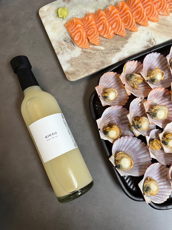샴페인 막걸리 [제 3탁주]와 제철 홍가리비 연어 사시미 페어링