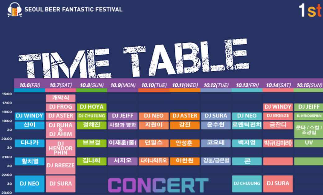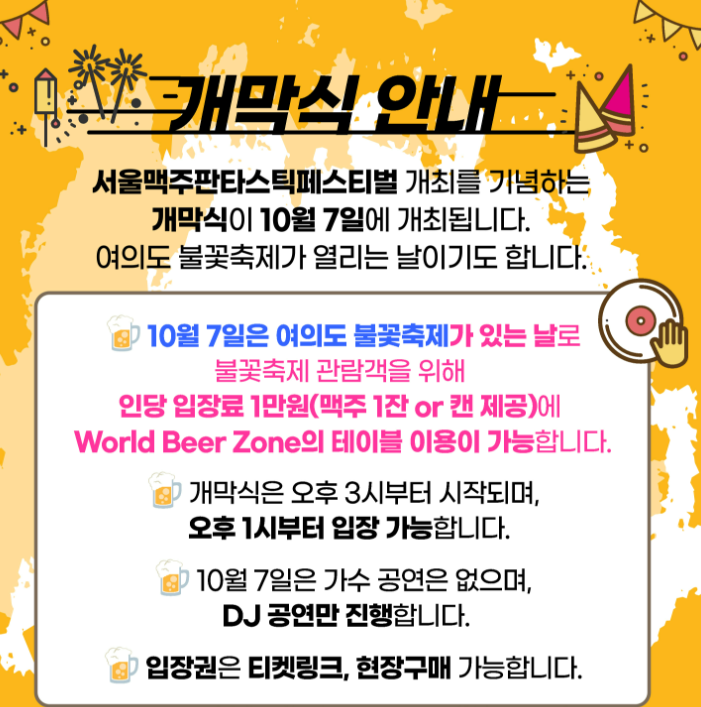 개막식이 열리는 10월 7일은 여의도 불꽃축제가 있는 날이기도 합니다. 불꽃 축제 관람객을 위해 인당 입장료 1만 원(맥주 1잔 또는 캔 제공)에 World beer zone의 테이블이 이용이 가능합니다. 개막식은 오후 3시부터 시작되며 1시부터 입장 가능합니다. 10월 7일은 가수 공연은 없고 DJ 공연만 진행합니다.