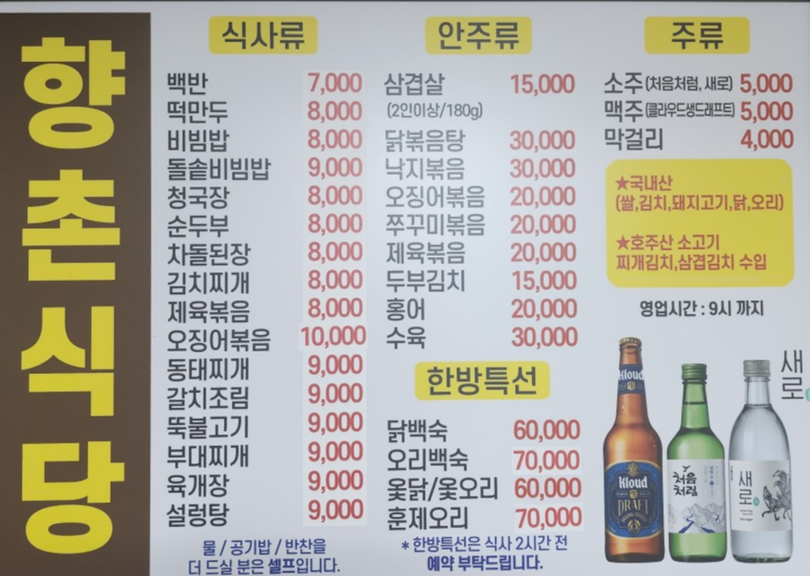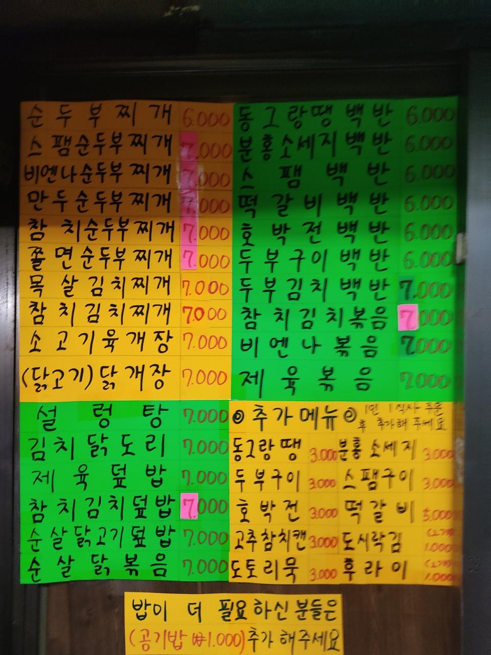 | 메인 메뉴 | 삼겹살, 식사류(순두부, 김치찌개 등) |