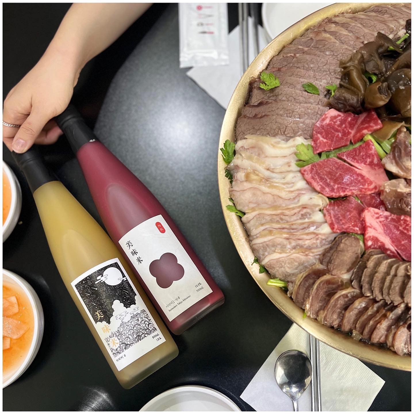 두 탁주 모두 고도수인데 곡물향과 부드러운 목 넘김 그리고 매력적인 향 때문인지 전혀 도수가 높다고 느껴지지 않았습니다. 뜨끈한 어복쟁반의 소고기를 한 점 한 점 집어먹으며 미미미 탁주를 홀짝홀짝 마시다 보니 취기가 올라오기는 했지만요. 탁주 자체로 너무 맛있고 맛과 향이 진하기 때문에 은은한 맛의 어복쟁반이 미미미 탁주를 아주 잘 서포트해주는 페어링이었다고 생각합니다.