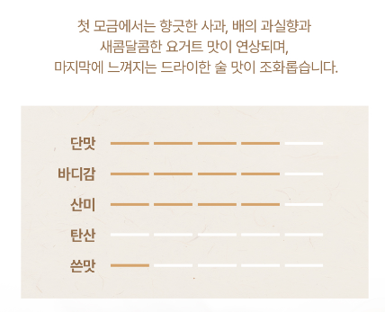 제이 1 농업회사법인 스마트스토어에 올라와있는 제품 정보입니다. 첫 모금에서는 향긋한 사과, 배의 과실향과 새콤달콤한 요구르트 맛이 연상되며 마지막에 느껴지는 드라이한 술맛이 조화롭습니다. 탄산은 없네요. 첫 잔은 있는 그대로 묵직하게 스트레이트로, 두 번째 잔은 얼음과 함께 부드럽게 마시기를 추천하고 있습니다. 배송 오는 대로 저도 리뷰 남겨볼게요!