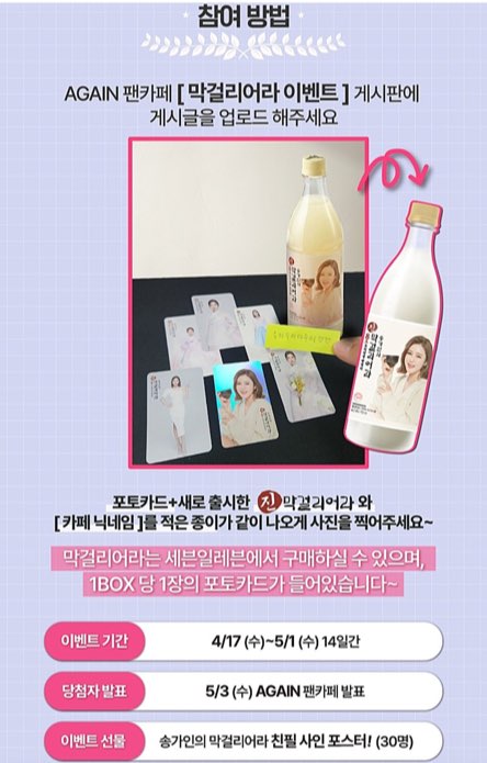 포토카드를 찾는 이벤트인데요. 새로 출시한 진 막걸리어라와 포토카드를 카페(송가인 AGAIN 팬카페) 닉네임과 함께 나오게 사진을 찍어 카페에 업로드하면 송가인의 막걸리어라 친필 사인 포스터를 30명에게 드립니다. 진 막걸리어라는 세븐일레븐에서 구매할 수 있으며 1박스당 1장의 포토카드가 들어있습니다.