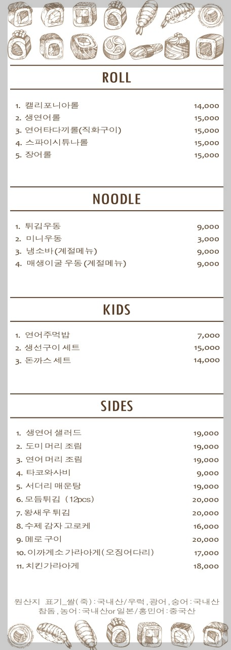 양이 적으신 분들은 단품으로 주문할 수도 있어요. 초밥을 먹지 못하는 어린이들을 위해 키즈메뉴로 생선구이와 돈까스 메뉴가 있어서 좋네요.