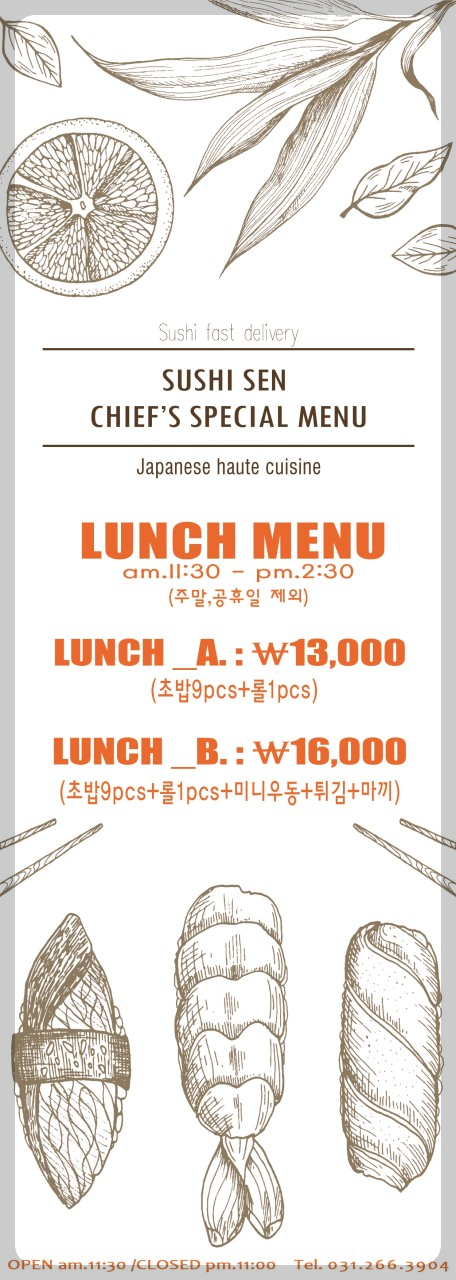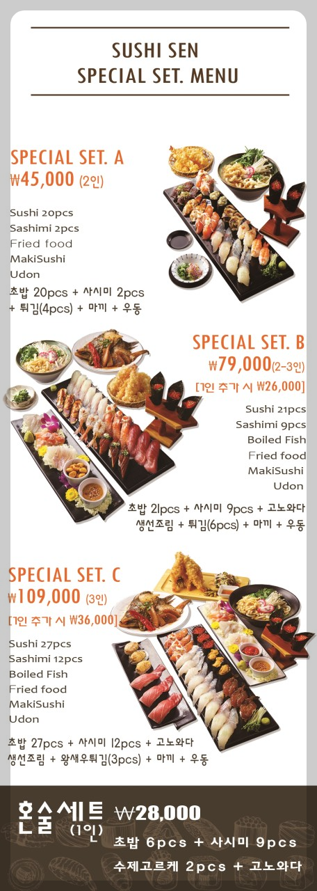 평일에는 합리적인 가격으로 런치 메뉴를 즐길 수 있습니다. 저는 주말에 방문해서 스시센 스페셜 세트 A를 주문했어요. 스페셜 세트 A에는 초밥 20피스와 사시미(광어/연어/참치 중에 선택 가능) 2피스, 튀김(고구마/새우) 4피스, 마끼, 우동이 제공됩니다.