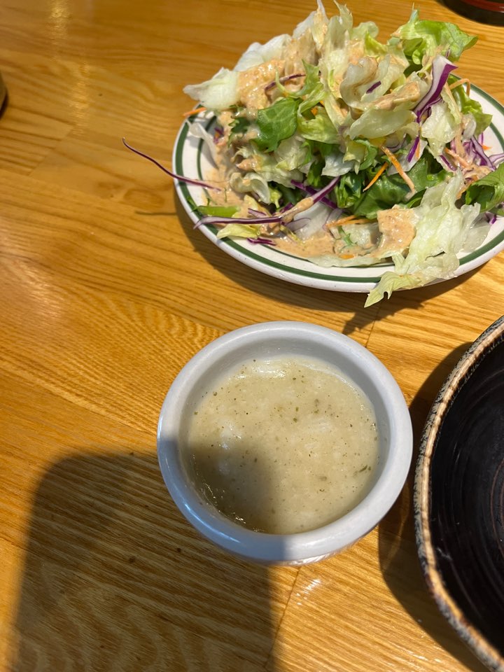 메뉴에는 적혀있지 않았지만 간장종지만한 접시에 따뜻한 죽이 나와요. 방문한 날 날씨가 매우 추웠는데 따뜻한 죽을 먹으니 몸이 따뜻해지면서 속이 편안해져서 좋더라고요. 고소한 드레싱이 뿌려진 샐러드도 입맛을 돋구기 아주 좋았습니다.