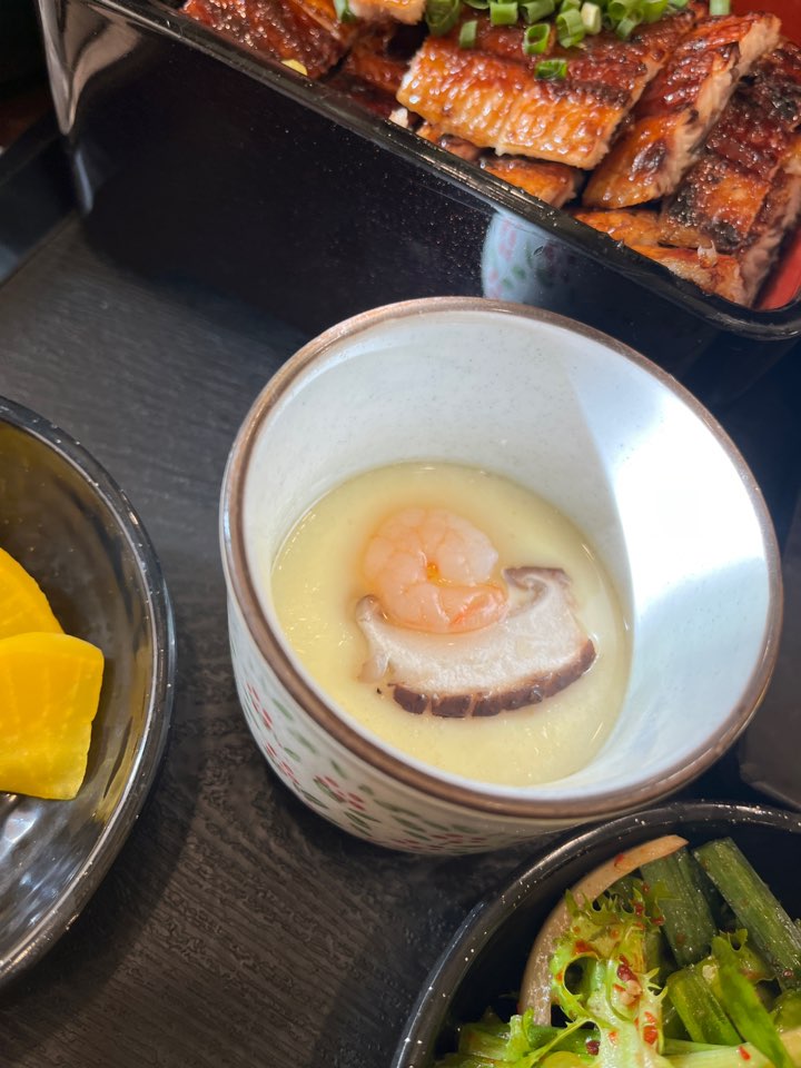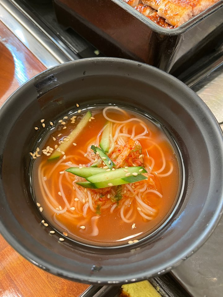 장어덮밥 특 사이즈입니다. 네모난 그릇 가득히 장어가 올라가있고 아래는 강황밥이 깔려있어요. 양배추 샐러드, 부추무침, 단무지, 계란찜, 새우튀김, 국물이 함께 제공됩니다. 크게 기대하지 않았던 계란찜이 간이 딱 맞고 맛있어서 리필하고 싶을 정도였어요. 1인 1 주문을 해서 김치말이 국수도 나왔습니다. 시원하고 칼칼해서 중간중간 입맛을 리프레쉬하기 좋더라고요.
