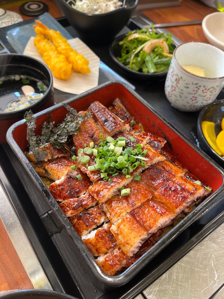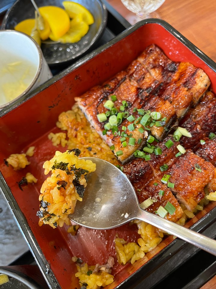 장어덮밥 특 사이즈는 정말로 양이 많습니다! 양 적으신 여자분들은 무조건 기본 사이즈로 시키세요. 아래 깔린 강황밥은 쫀득하고 간이 잘 베어있었어요. 장어는 아주 두툼한 편은 아니었지만 짭조름한 양념이 아주 맛있었고 적당히 구워져서 부드러웠어요. 왜 장어덮밥 맛집인지 알겠더라고요.