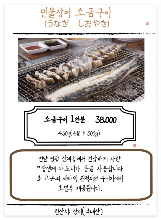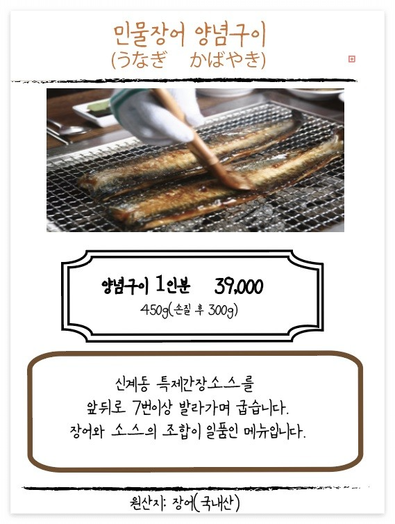 장어덮밥은 기본 200g짜리와 특 300g짜리 두 종류가 있어요. 1인 1 주문 시 김치말이 국수를 서비스로 주십니다. 구이류는 소금구이와 양념구이가 있어요.