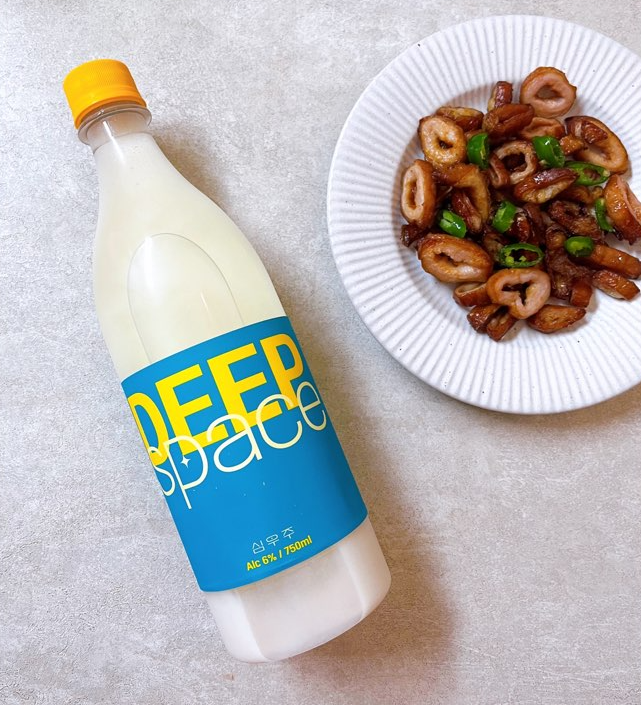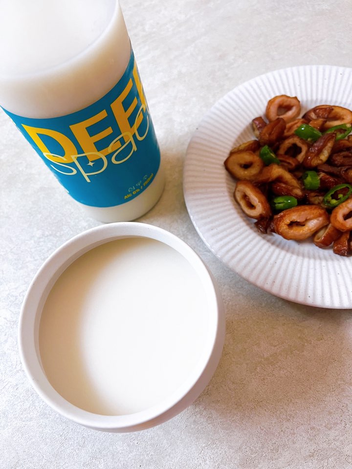 매콤한 안주가 금방 완성되었어요. 심우주 막걸리는 요거트같은 풍미의 막걸리라고 소개되어 있는 만큼 잔에 따르면서 느껴지는 쫀득한 질감이 인상적이었습니다. 유청이 들어가 더욱 뽀얗고 치즈같은 느낌도 나는 것 같았어요. 한눈에 보기에도 부드러워 보이는 막걸리였어요. 많이 달지 않으면서 탄산은 없었고 밀도감이 높은 탁주입니다. 팔팔양조장의 팔팔막걸리보다 조금 묵직하다고 생각하면 돼요. 팔팔 막걸리보다는 심우주 막걸리가 조금 더 제 취향이네요.