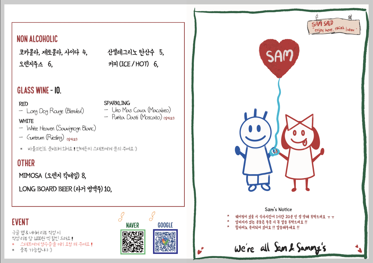 주류는 글라스와인(레드, 화이트, 스파클링)이 1만원에 판매중이며