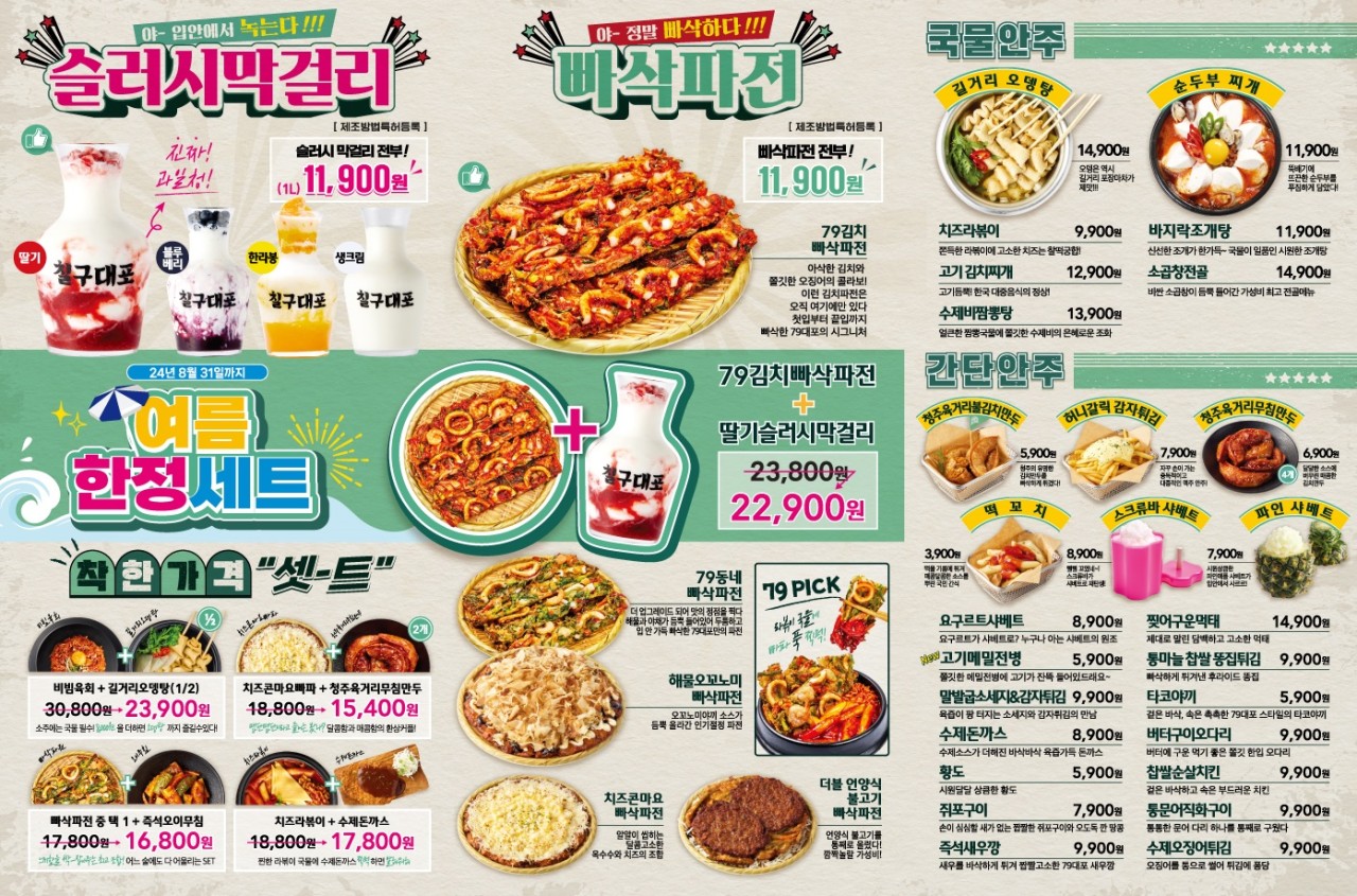 79 대포는 빠삭전과 슬러시막걸리가 대표메뉴입니다. 1L짜리 슬러시 막걸리는 딸기, 블루베리, 한라봉, 크림 맛 총 4가지가 있어요. 빠삭전은 파전, 오꼬노미야끼, 치즈콘마요, 불고기가 있습니다. 반찬 가지러 갈 때 보니 대부분의 테이블에 빠삭전은 기본으로 하나씩 있더라고요.