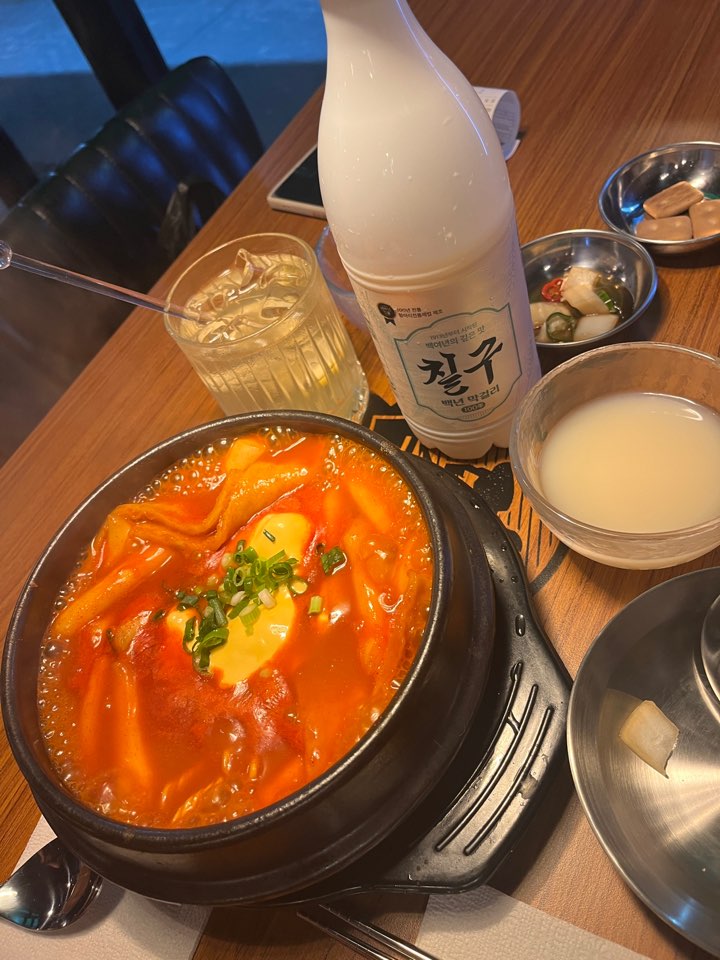치즈라볶이, 길거리 어묵탕, 칠구 막걸리, 클래식 하이볼을 주문했습니다. 클래식 하이볼은 친구가 마셨는데 짐빔 하이볼인 것 같다고 하네요.