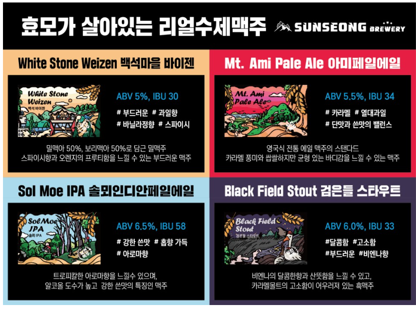 순성브루어리 펍에서 판매 중인 바비큐 플레이트와 수제맥주입니다. 현재 판매 중인 수제맥주는 총 4가지로 백석마을 바이젠, 아미페일에일, 솔뫼인디언페일에일, 검은들 스타우트입니다. 이름이 참 멋스럽죠? 자세한 맛 설명은 아래 이미지를 참고해 주세요.