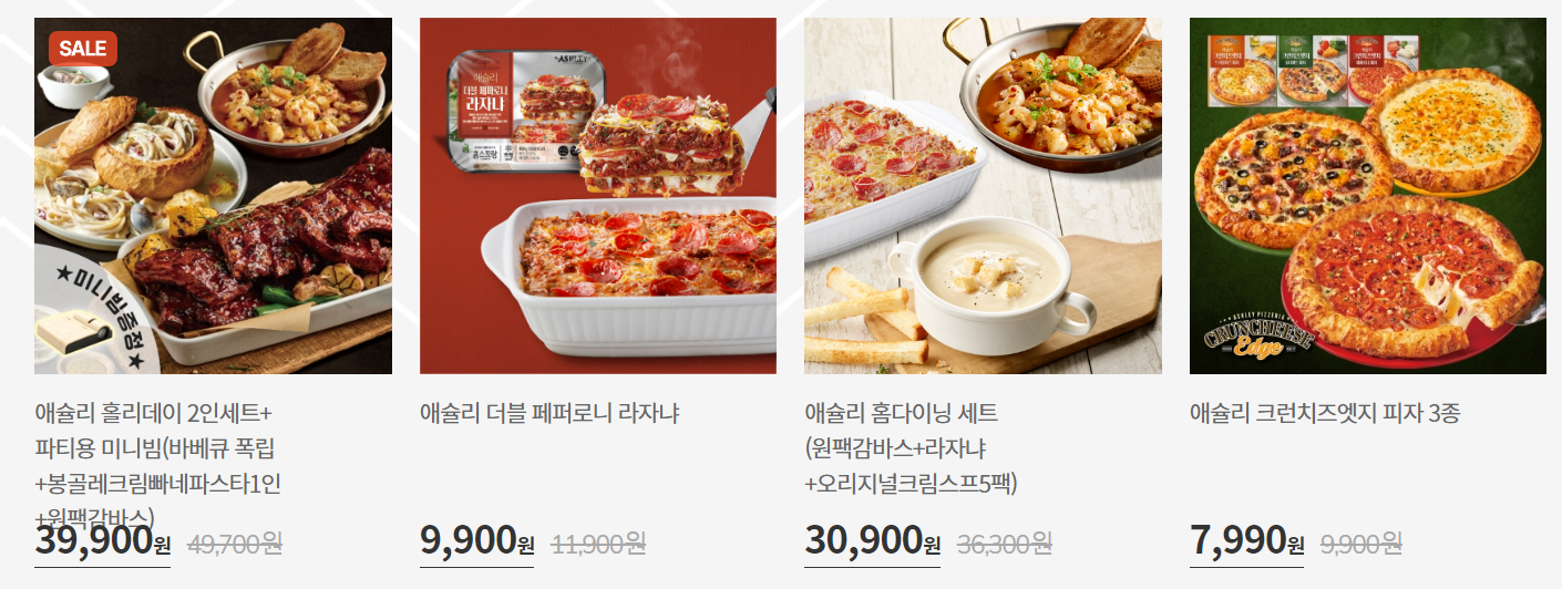 애슐리의 음식들을 밀키트 형식으로 판매하는 공식몰이 있어요. 살펴보니 크리스마스 홈파티에 어울릴만한 음식들이 많더라고요. 크리스마스도 다가오는데 한 번 구경해 보세요!