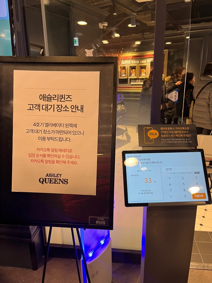 입구에 대기 예약 키오스크가 있어요. 핸드폰 번호와 인원수를 남겨놓으면 카톡으로 입장 알림을 보내줍니다. 대기 장소가 따로 있지만 입구에서 기다리시는 분들이 많아 복잡했어요.