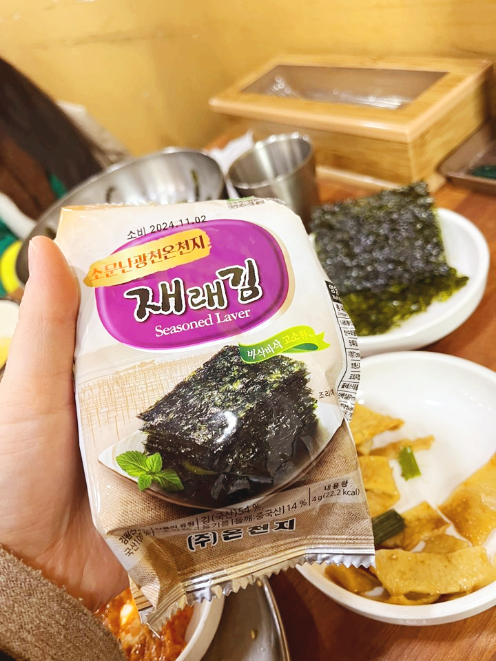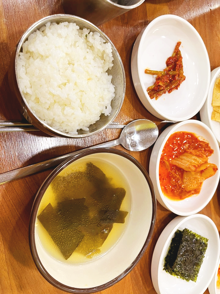 기본 제공 미역국도 맛이 좋아서 리필했어요. 김은 저렇게 한 봉지만 리필 가능해요. 반찬으로 한 공기, 불고기로 한 공기, 기본 두 공기는 먹어야 하는 맛집이네요. 소주, 막걸리가 너무 마시고 싶었지만 12시도 안된 시간이라 참았습니다. 다음에는 꼭 술 한잔 곁들이고 싶어요!