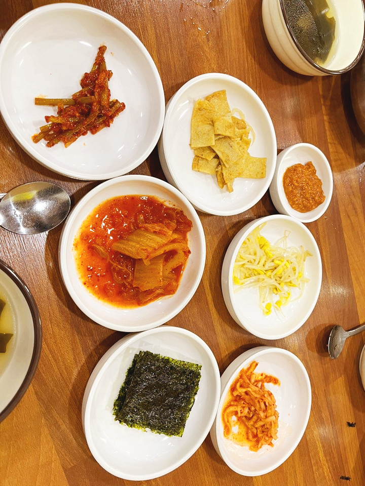백반집답게 다양한 반찬이 먼저 제공됩니다. (구운 김, 김치, 마늘쫑무침, 어묵볶음, 콩나물무침, 오징어채, 상추쌈, 미역국, 공깃밥.) 모든 반찬은 셀프로 리필이 가능해요. (김만 1회 추가 제공)