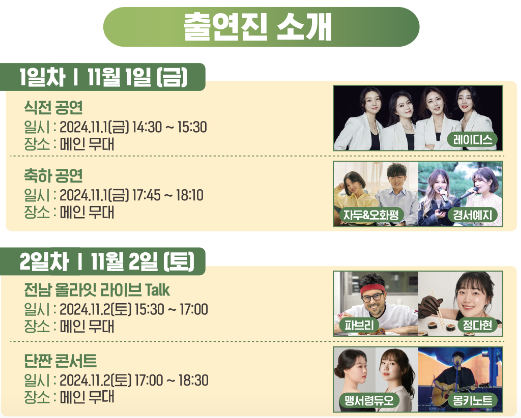 주목할 만한 일정은 11월 2일(토) 15:30부터 진행되는 전남 올라잇 라이브 토크일 것 같아요. 왜냐하면 흑백요리사에 출연했던 파브리 셰프가 출연하기 때문입니다. 행사장에 방문하신다면 이 시간은 꼭 기억해 두시면 좋겠네요.