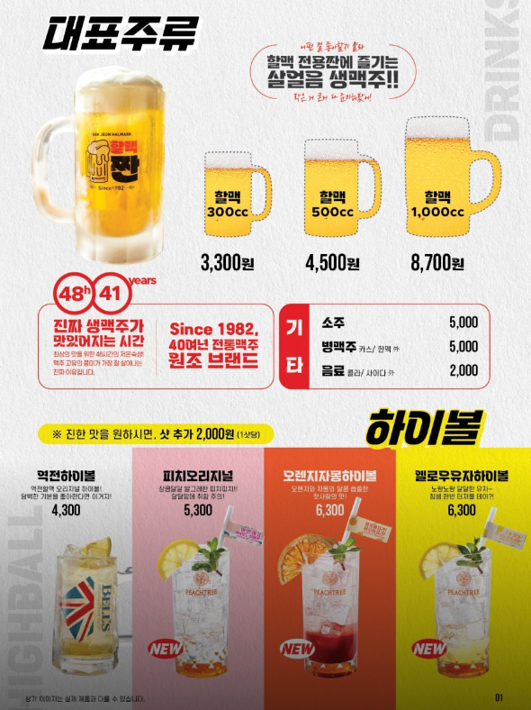 역전 할맥을 유명하게 만든 살얼음 생맥주는 세 가지 용량(300ml, 500ml, 1000ml)이 있습니다. 그 외에 병맥주와 소주도 있고요. 가성비 좋은 하이볼도 준비되어 있네요. 가장 기본인 역전 하이볼(4,300원) 이외에 복숭아맛의 피치 오리지널(5,300원), 오렌지자몽하이볼(6,300원), 옐로우유자하이볼(6,300원)이 신메뉴로 나와 있습니다.
