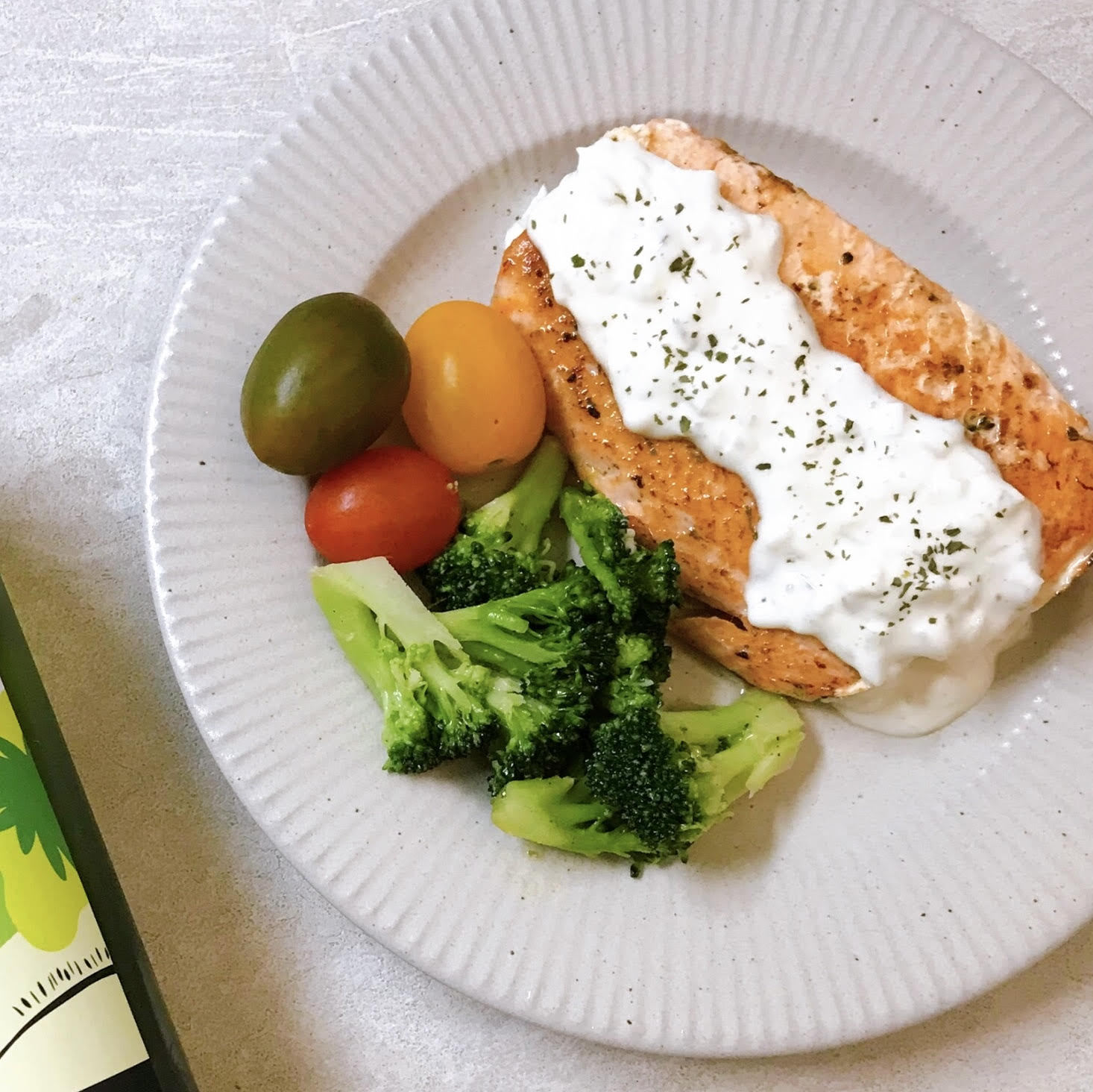 - 접시에 브로콜리, 방울 토마토, 연어를 올리고 연어 위에 타르타르소스를 뿌려서 마무리합니다.