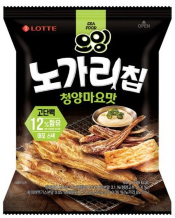 가장 먼저 소개해 드릴 과자는 색다른 바삭함, 진한 해물맛, 매콤고소한 청양마요맛이라는 롯데 오잉 노가리칩 청양마요맛입니다. 먹태깡이 처음 나왔을 때 오잉칩이랑 비슷하다는 이야기가 있었죠. 그래서인지 롯데웰푸드에서 발 빠르게 오잉 노가리칩 청양마요맛을 출시했습니다. 지난 9월 4일부터 전국 편의점에서 판매가 시작되었고 9일에는 대형마트, 11일에는 동네 마트순으로 출시될 예정입니다.