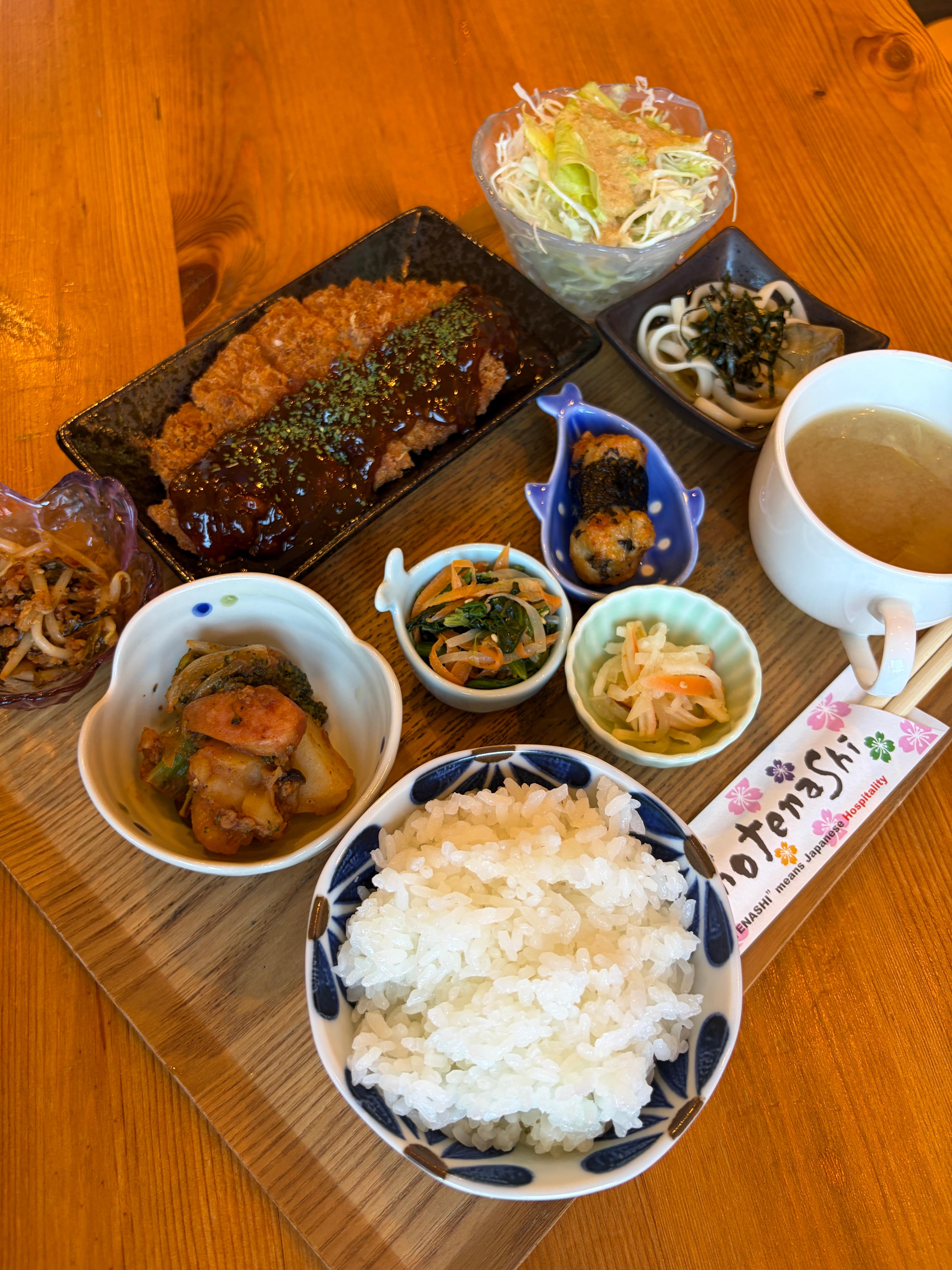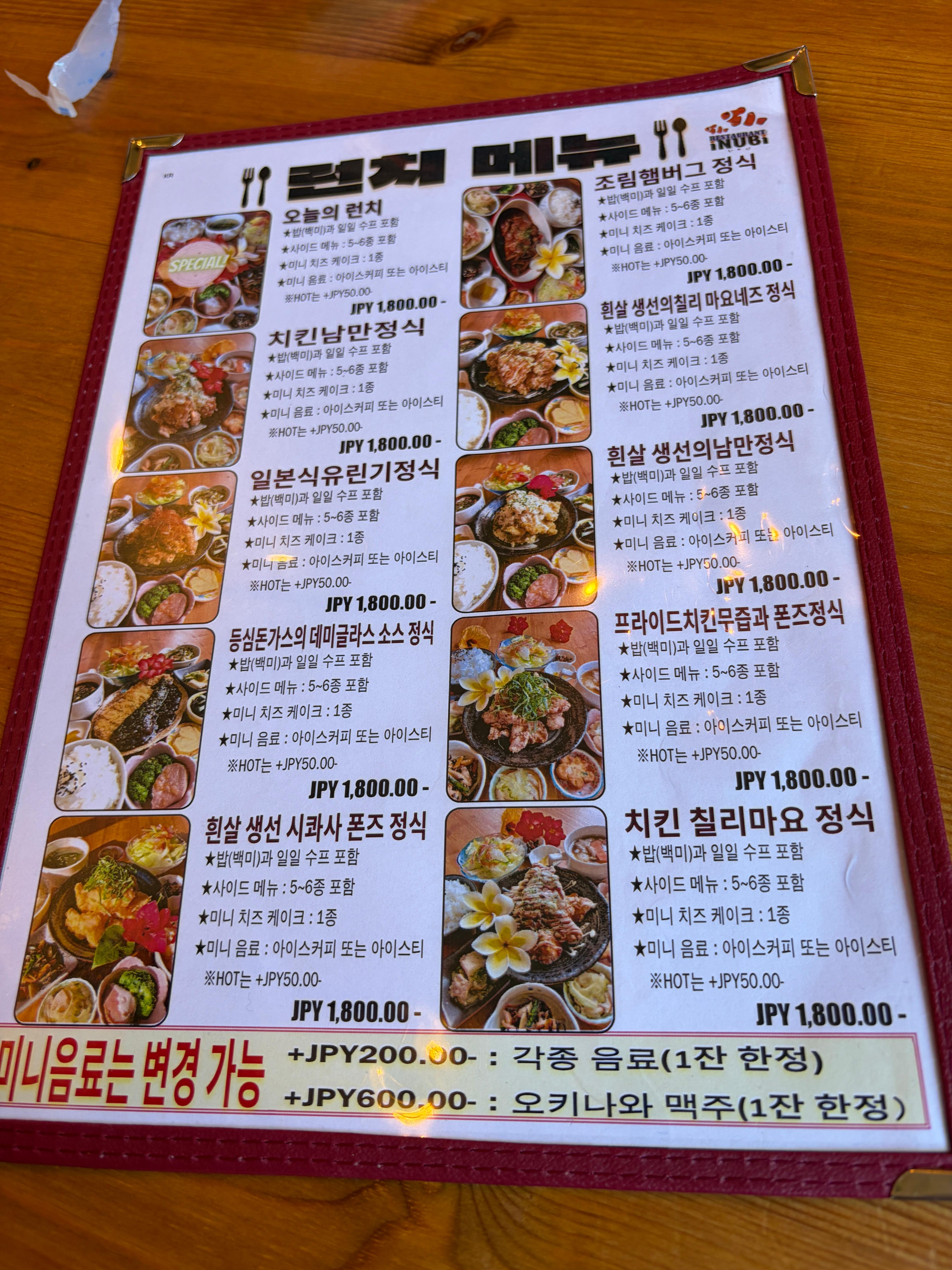 한국어 메뉴판이 있어서 매우 편리합니다. 정식에는 메인요리와 함께 밥, 국, 반찬, 미니 음료, 치즈케이크가 포함이에요. 단품으로도 시킬 수 있어서 저희는 정식 3개, 단품 1개를 주문했습니다.