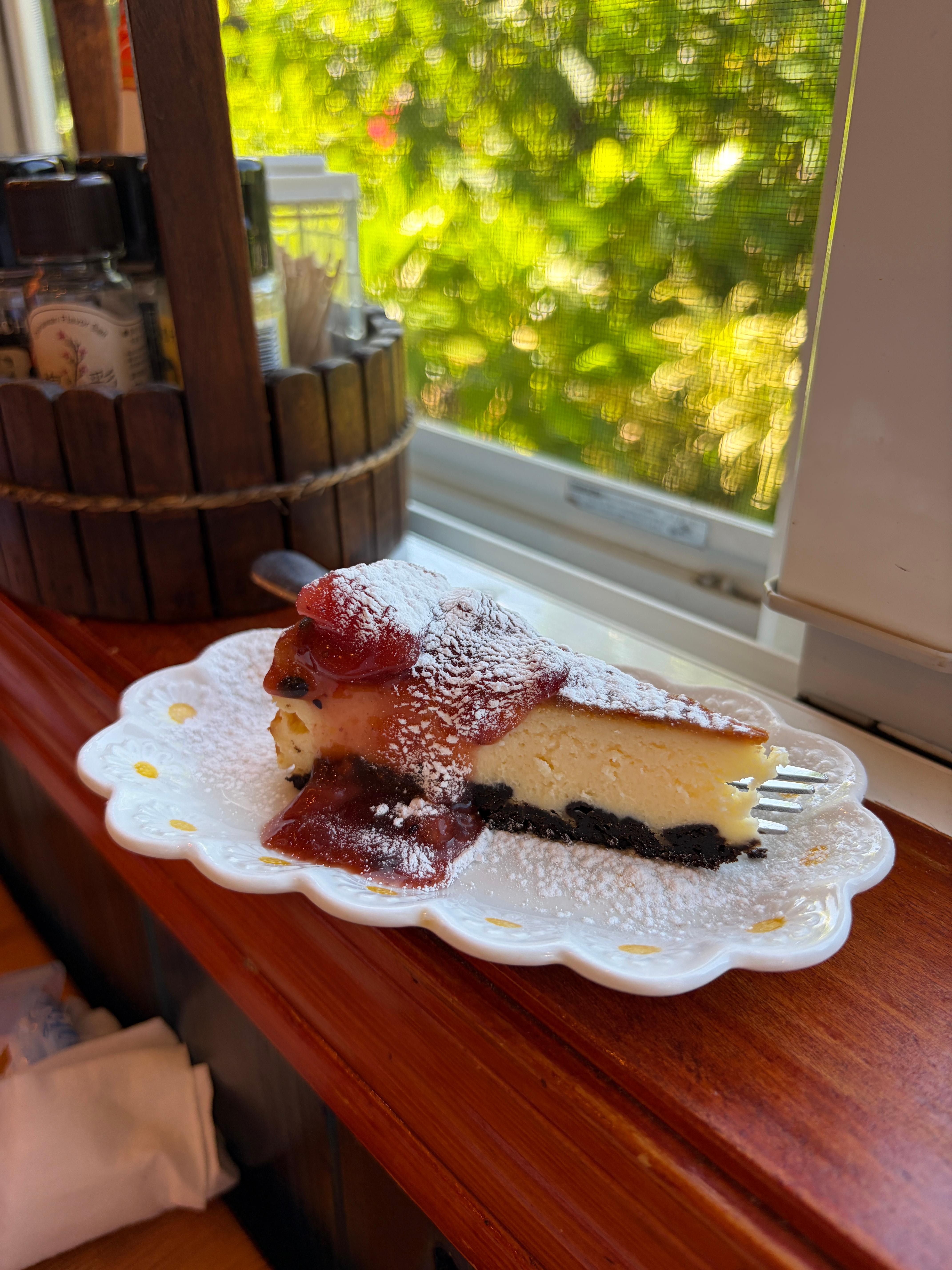 가운데 사진은 아이들이 홀릭했던 디저트 치즈케이크인데요. 꾸덕하고 진한데 위에 딸기잼을 뿌려서 달콤한 맛까지 추가되니 아이들이 좋아할 수 밖에 없는 맛이었습니다. 아이스티는 홍차 아이스티라서 아이들이 먹기엔 좀 힘들더라고요.