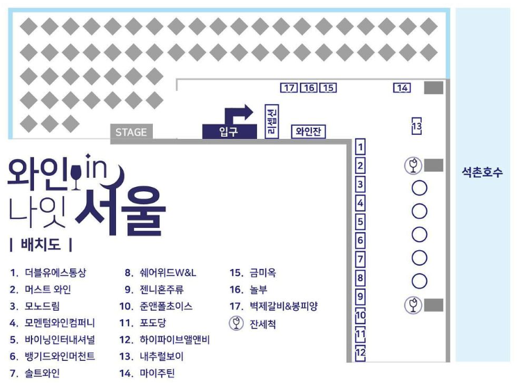 소피텔 앰배서더 서울  호텔 6층 테라스에서 열리는 와인나잇 인 서울의 배치도입니다. 참여업체를 확인해 보세요. 배치도 상에서 동그라미는 테이블을 의미하는데요. 바틀 제품과 음식을 구매한 분들에 한해 테이블 이용이 가능합니다. 선착순 이용 가능하고 구매 확인이 되지 않으면 현장 스탭이 자리 이동 양해를 구할 수 있다고 하네요.