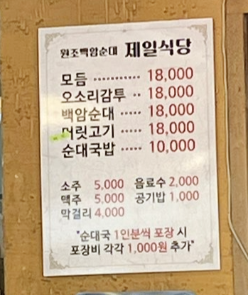 메뉴는 순대국밥, 백암순대, 머릿고기, 오소리감투, 모듬으로 단출합니다. 주류는 소주, 맥주, 막걸리가 있는데 막걸리는 용인 백암 생막걸리였어요. 순댓국 1인분씩 포장 시에는 포장비(1,000원)가 인분수만큼 추가된다고 해요.