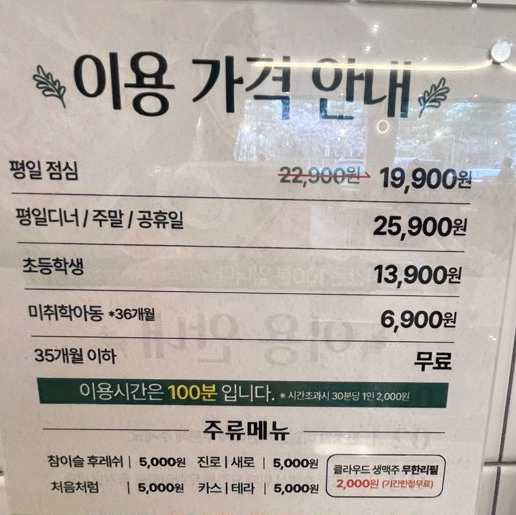 평일 점심에는 19,900원, 평일 디너 및 주말 공휴일에는 25,900원에 샤브샤브와 월남쌈을 100분간 무제한으로 즐길 수 있습니다. 초등학생은 13,900원, 미취학 아동은 6,900원, 35개월 이하는 무료입니다. 주류로는 소주, 맥주가 있고 클라우드 생맥주 무한리필도 2천원에 가능합니다.