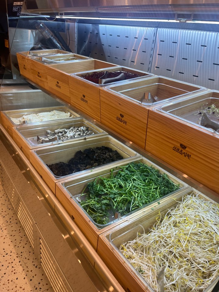 셀프 픽업존에 육수와 샤브샤브 고기가 세팅되어 있어서 원하는대로 가져다 먹으면 됩니다. 고기는 삼겹양지와 우목심 두 종류가 있어요. 의외로 우목심보다 삼겹양지가 맛있더라고요!